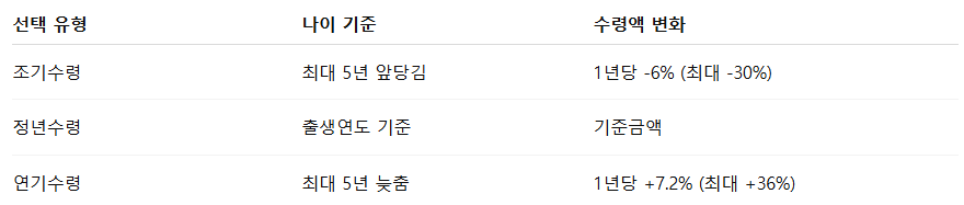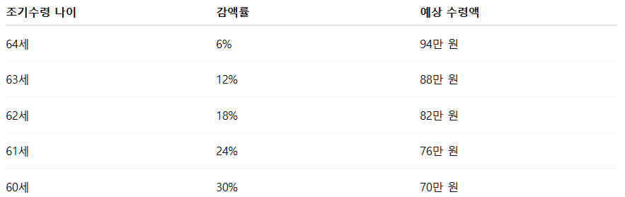 - 최대 5년(60세~64세)까지 조기수령 가능 → 최대 30% 감액