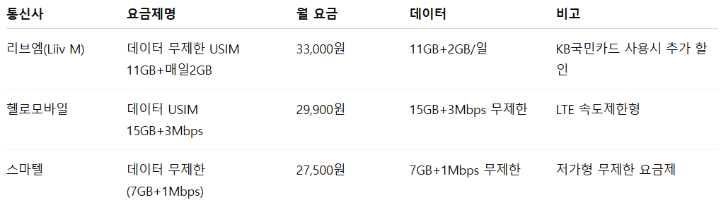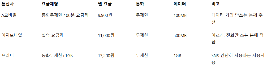 알뜰폰 요금제 비교