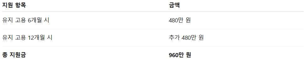 즉, 1인을 정규직으로 채용하고 1년 이상 고용 유지 시, 기업은 960만 원의 인건비 부담을 덜 수 있는 구조입니다. 이는 기업 입장에서는 큰 재정적 도움이 되며, 청년에게는 안정적인 일자리 기회를 제공합니다.