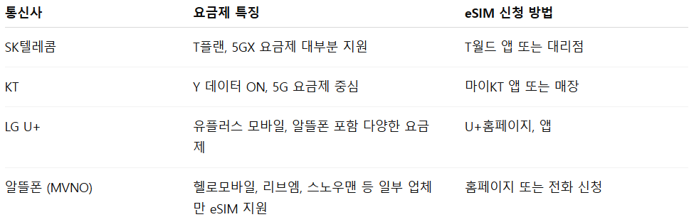 ✅ 국내 통신사별 eSIM 요금제 요약 (2025년 기준)